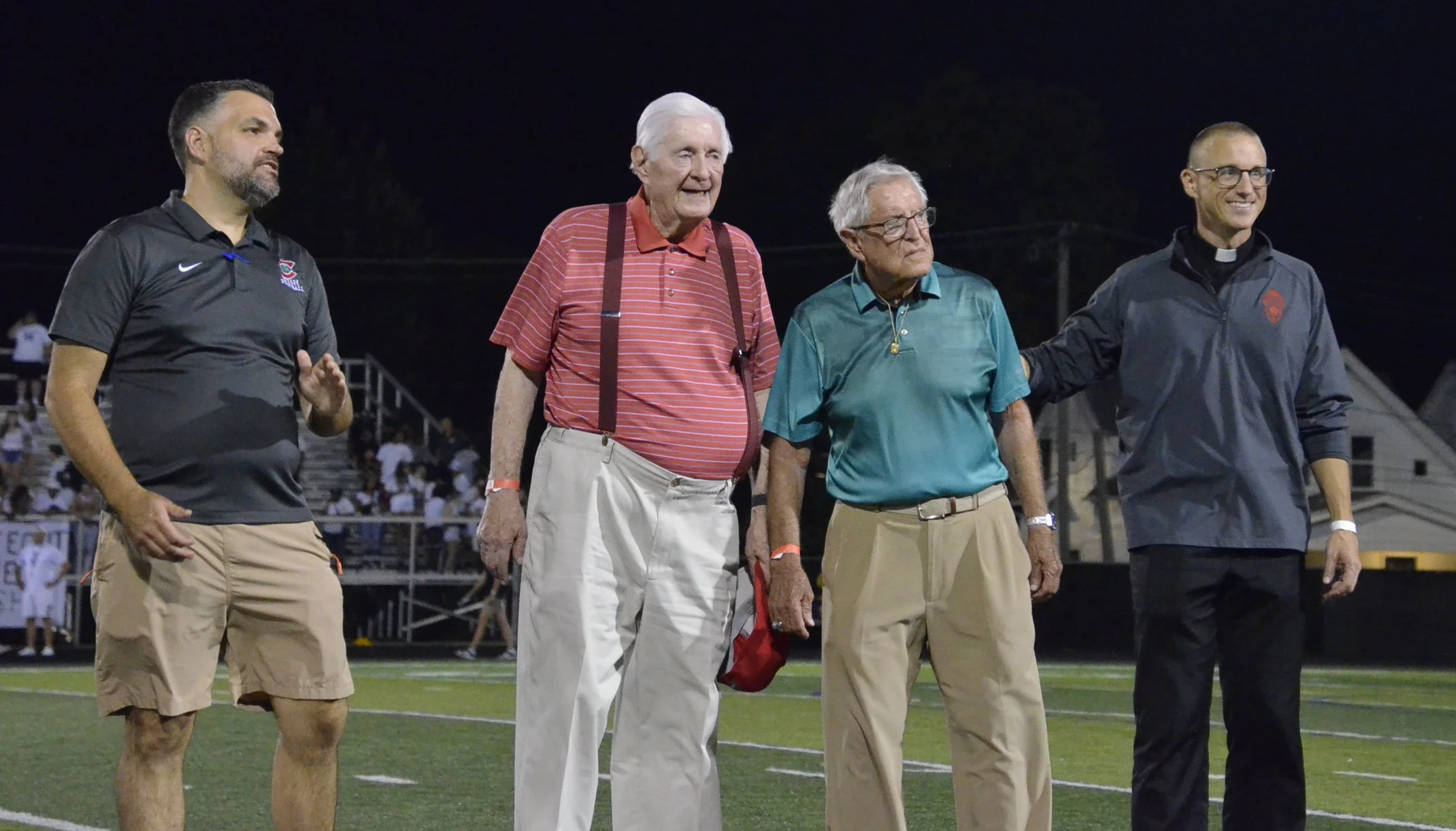 Central Catholic honored two 1957 graduates who served in the military during its football game on Friday at Gallagher Stadium. Students were dressed in red, white, and blue to honor our country and our military. The veterans, Ron Glick and Ron Zak, were recognized on the field between the 3rd and 4th quarters as the Fighting Irish took on rival Whitmer.
