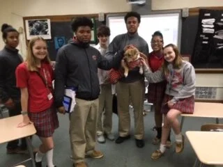 Over the last few months, Georgia and Mrs. McKinley have completed emotional support dog training classes, and Georgia has just arrived at Central Catholic! The students will help further her therapy training and may visit other schools or hospitals with her. The dog resides predominantly in Mrs. McKinley’s classroom during the school day and goes home with her each evening.