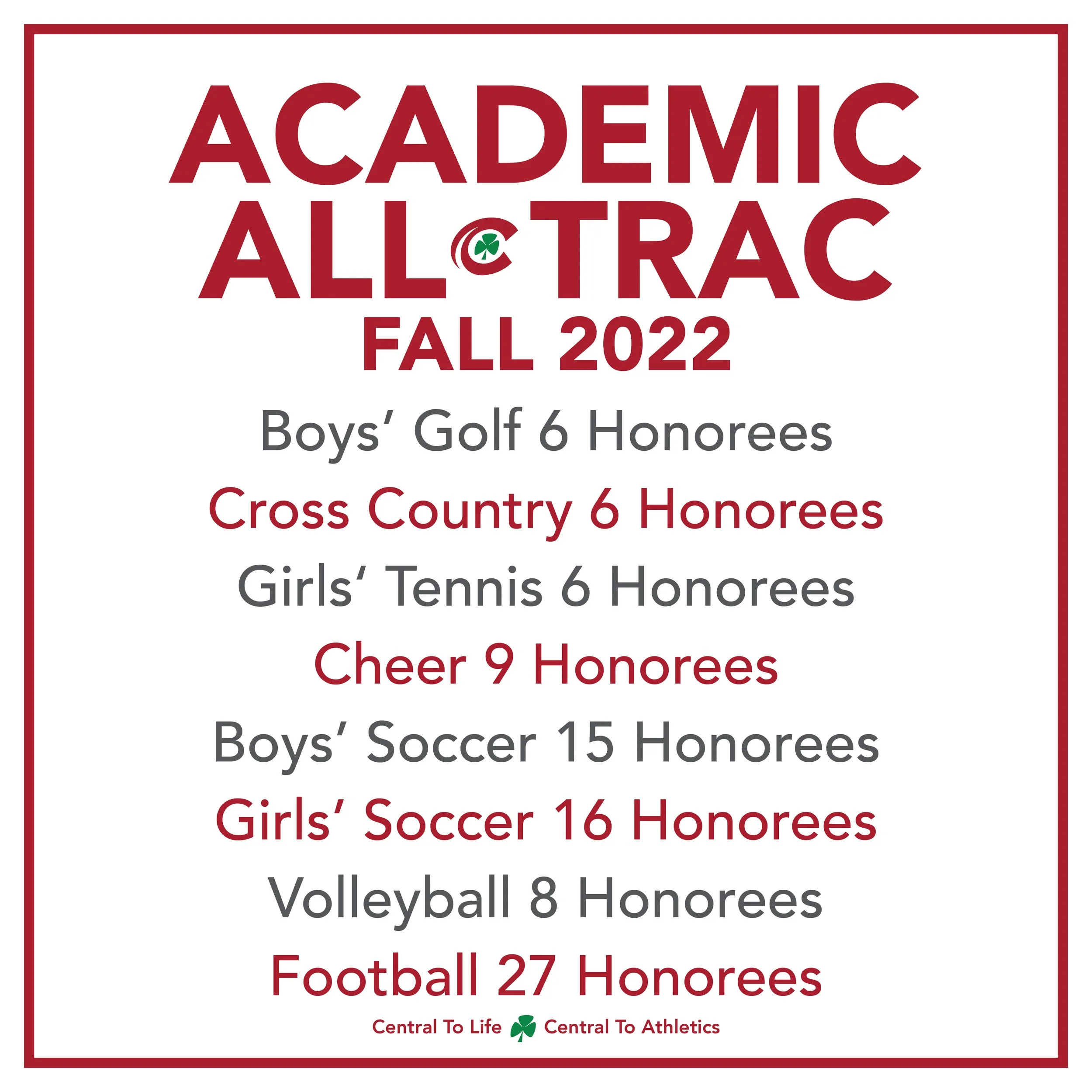 Central Catholic placed 93 student-athletes on the Academic All-Three Rivers Athletic Conference squad covering 8 fall sports, the league office recently announced.