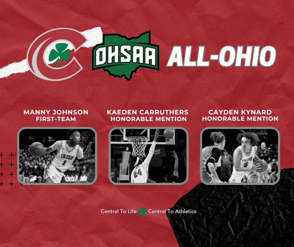 Three members of the Central Catholic boys’ basketball team have earned Division III All-Ohio recognition, as announced Thursday by the Ohio Prep Sports Media Association (OPSMA). Senior Manny Johnson was named First-Team All-Ohio, while senior Kaeden Carruthers and junior Cayden Kynard received Honorable Mention All-Ohio honors.